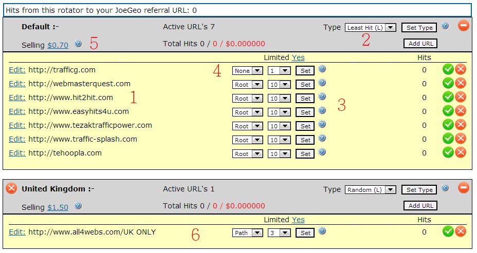 << Back The image above shows �a good general setup, generally this type of setup will work well for most people who promote a range of sites. 1. All the sites you want to promote, (they can be added in any order) 4. I've �set one site to NOT use a limiter "None", this gives your visitors somewhere to go if they have seen all the other sites in your geo rotator. 5. I've set the selling number to a reasonable figure, you can adjust this if you want or leave it off. 6. I've setup a country rotator so all my UK traffic can be sent to a different site, I've set the selling figure higher for my UK traffic and limited the site to only be shown a maximum of 2 times per visitor. Sales: The selling of your traffic will only happen if an advertising campaign is running and the bid is higher than your selling price. |